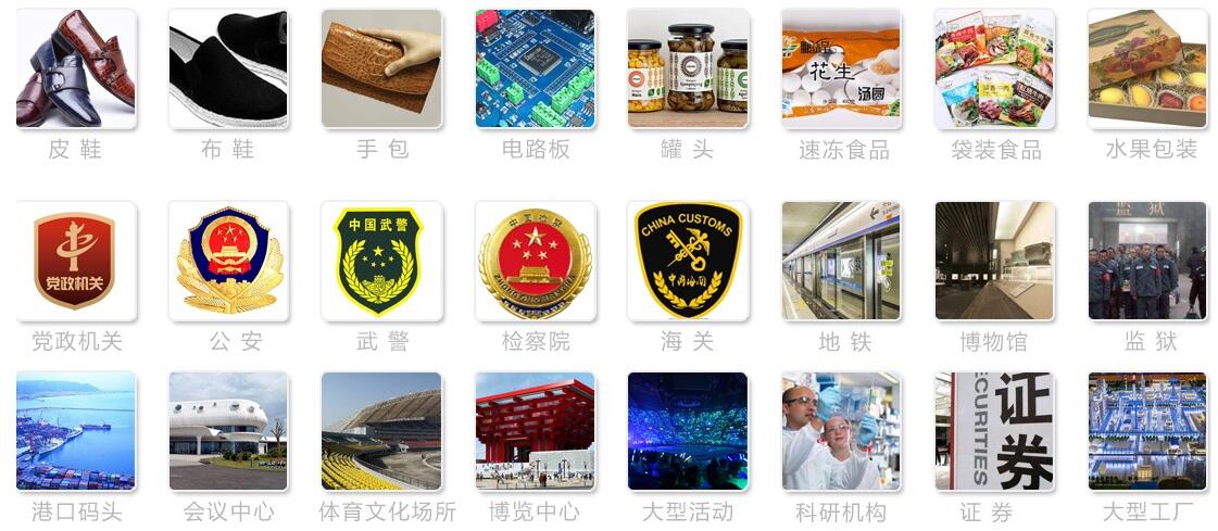 公安武警、法院、监狱、地铁、海关车站、港口码头、物流快递、酒店学校、工厂企业及其他公共场所的重要部门。主要用来检测大件货物、包裹、邮件、箱包、等物件中所隐藏的违禁物品和易燃易爆品,如管制刀具、枪支、烟花爆竹、酒精乙醇、汽油硫酸的等。