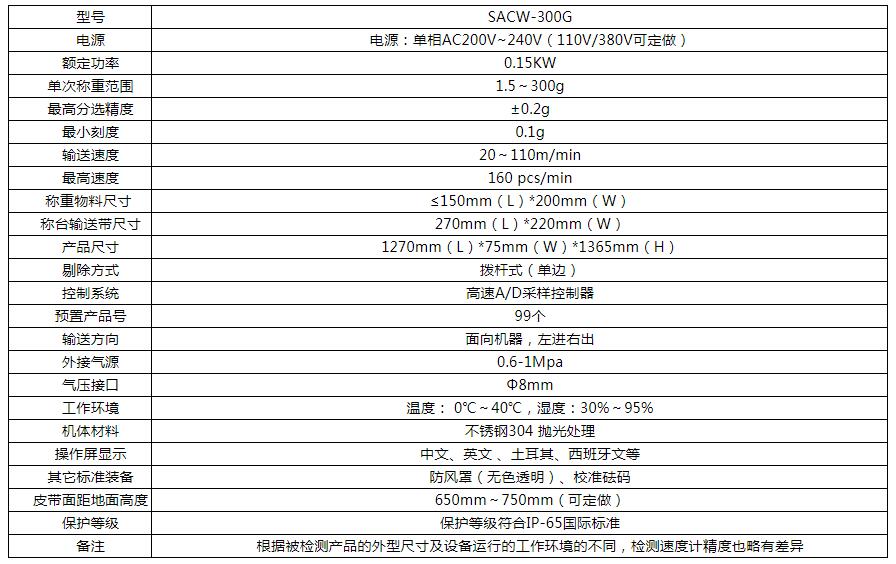 SACW-300G重量选别秤是一种应用于各种自动化流水线以及物流输送系统上的自动重量检测、上下限判别或根据重量检测产品是否合格的高科技自动化分选设备。通用型称重选别称比较适用于盒装、包裹箱装、单品样品包装产品在线自动称重检测、欠重检测、漏装检测,附件缺失检测等,广泛用于食品、制药、日化、电子、工业品、五金、军工等重量品质检测苛刻行业产品。