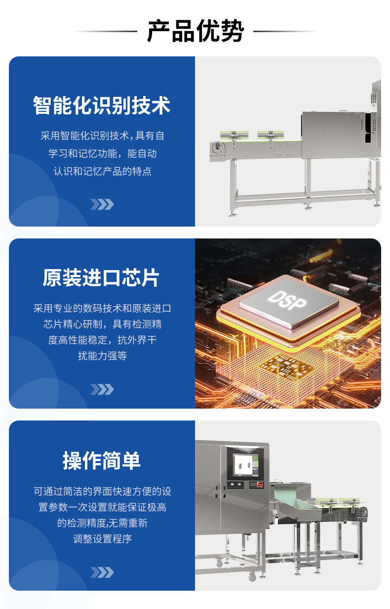 | 检测精度 | SUS 304球:Φ0.3mm 金属丝:Φ0.2×2mm 陶瓷玻璃球:Φ1.0mm 备注:最小可检测的异物尺寸与产品内物质成分、包装材料、厚度大小等参数有很大关系。在实际生产环境中,请以实际产品测试结果为准。 |