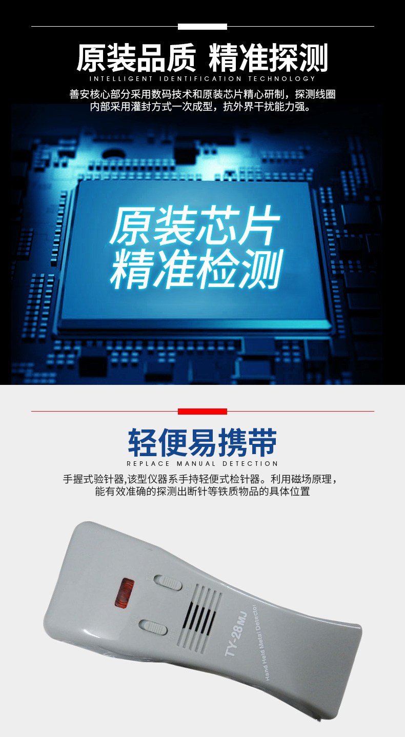 可对针织、衣料、袜、被服、皮革、鞋材等薄、小件制品进行断针探测,能迅速正确找到断落的铁针断头。可用于五金钮扣等服装服饰配件进行铁磁性杂质探查。可对人体、牲畜等工伤、刀伤、压伤等部位进行检查,检查其内部是否渗进有害铁屑物。还可用于边防关哨检查,公务人员对被检人员的暗藏工具的迅速搜查。